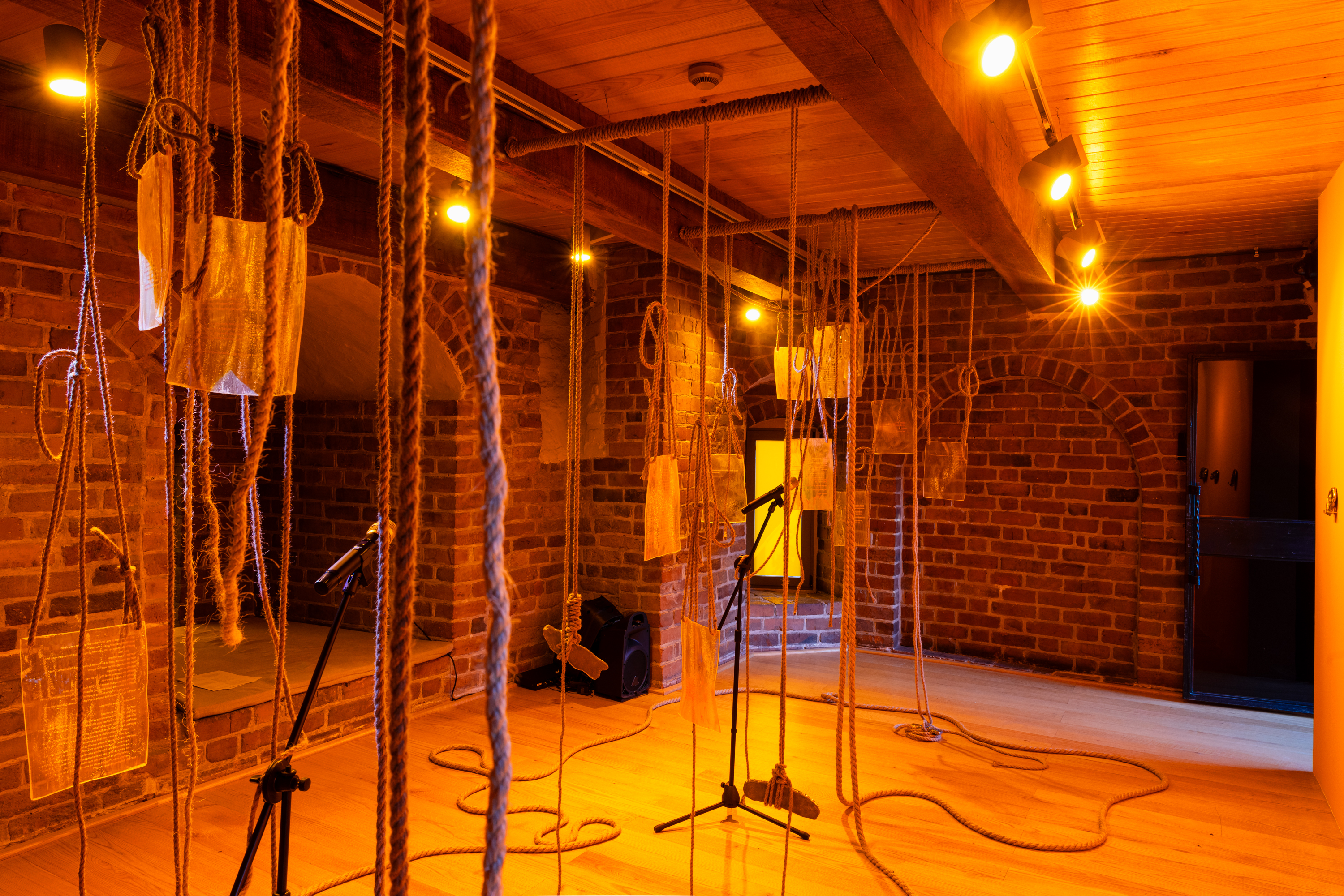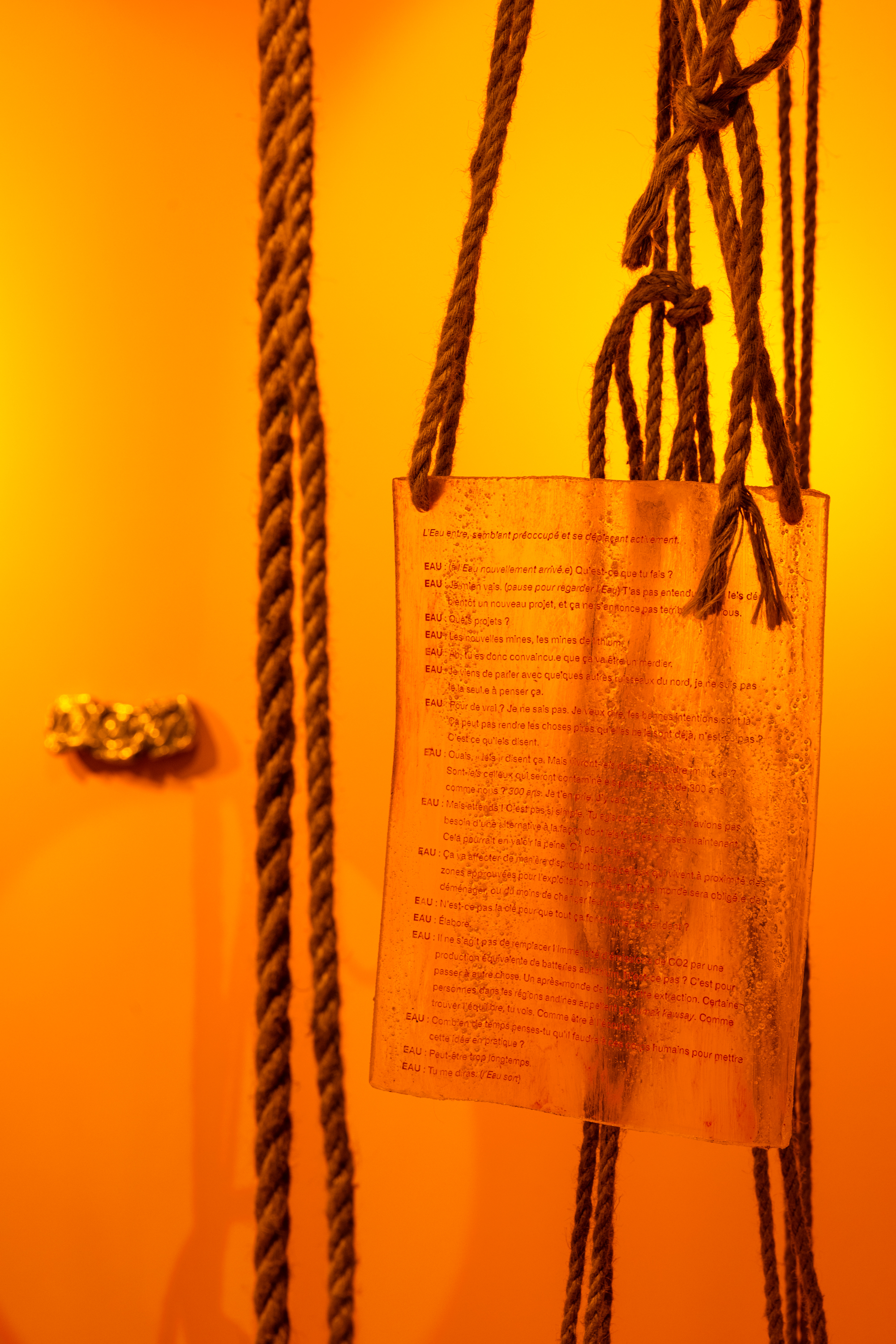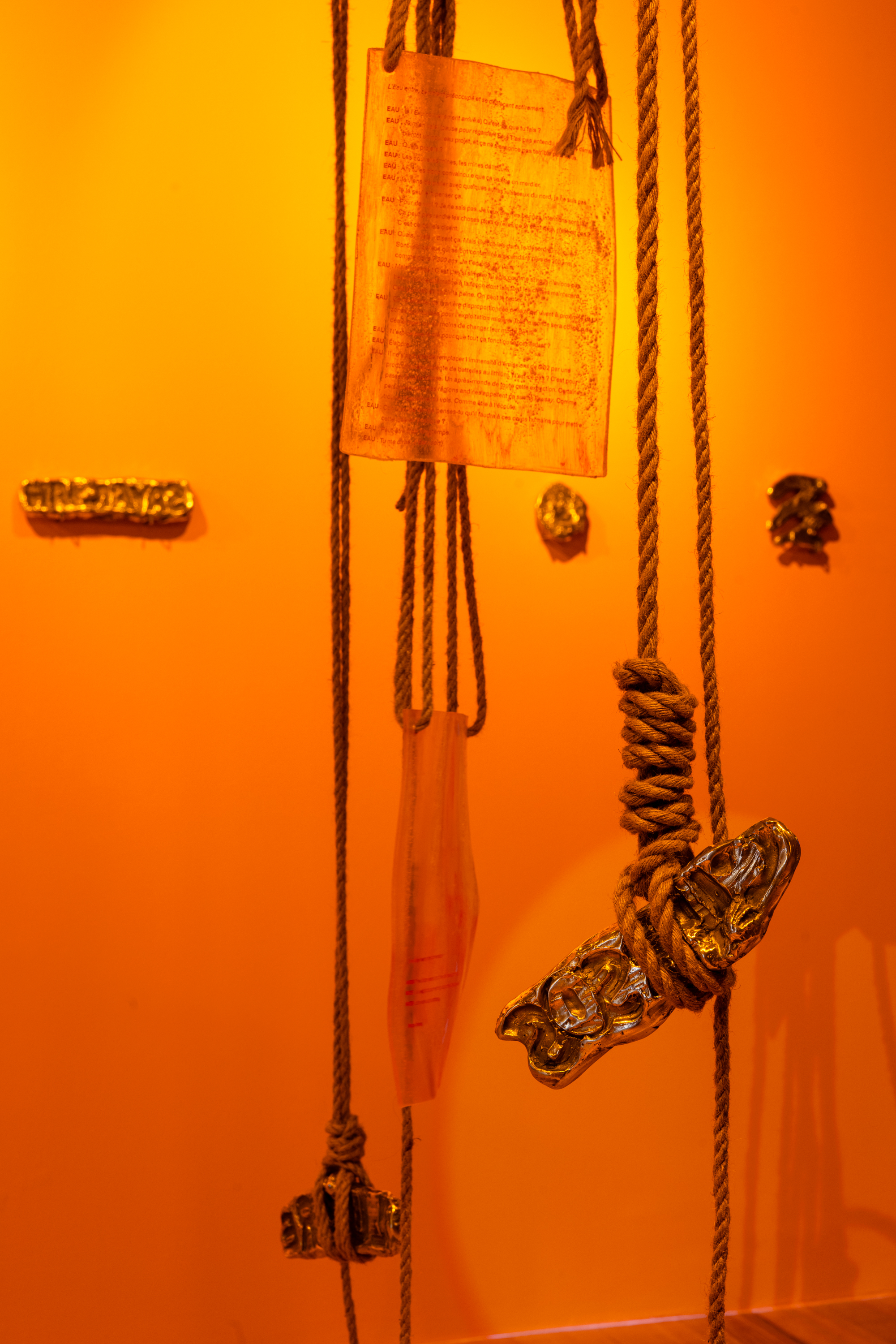 Text, microphone, Manila hemp rope, cast aluminum, laser engraved acrylic